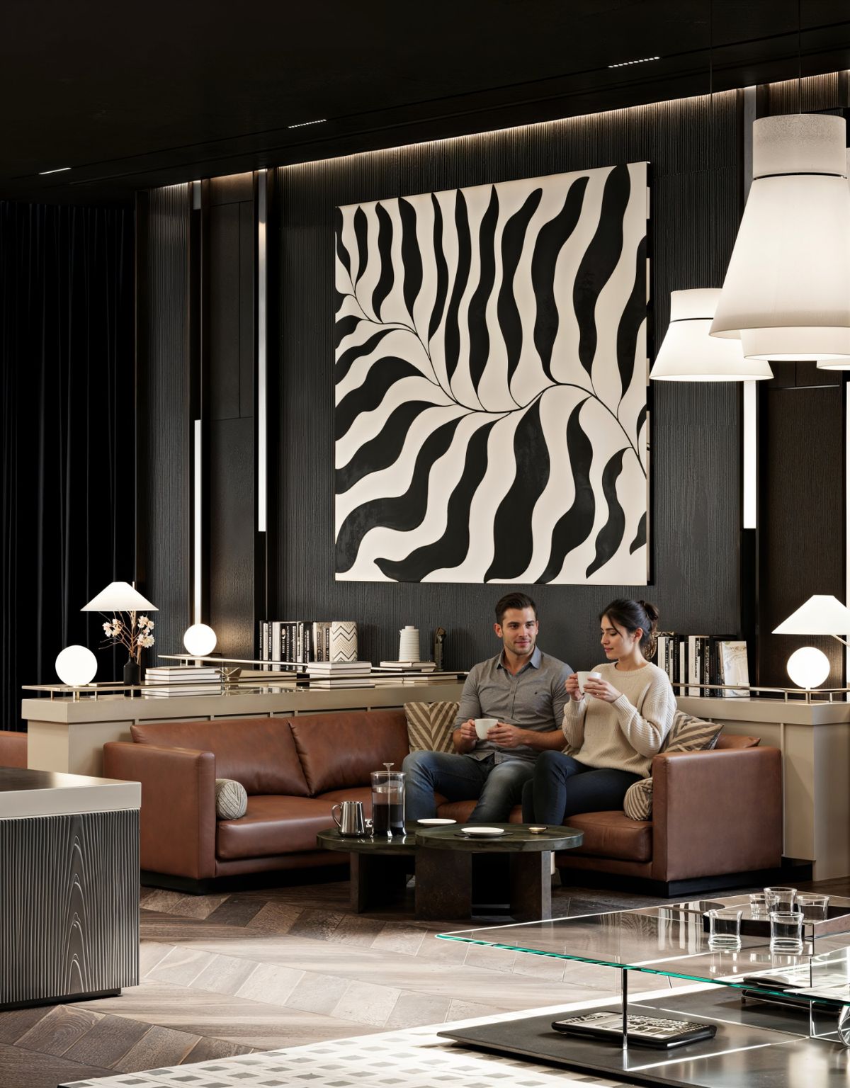 İç mekânda servis alanı ve oturma düzeni sade bir planlama anlayışıyla ele alındı. Bar, mekânın merkezinde konumlanarak akışı tanımlarken; malzeme seçimleri, koyu ahşap yüzeyler ve doğal tonlarla bütünlüklü bir atmosfer oluşturuyor. Oturma alanları, kısa süreli kullanımlar kadar uzun süreli vakit geçirmeye de imkân tanıyacak şekilde kurgulandı.